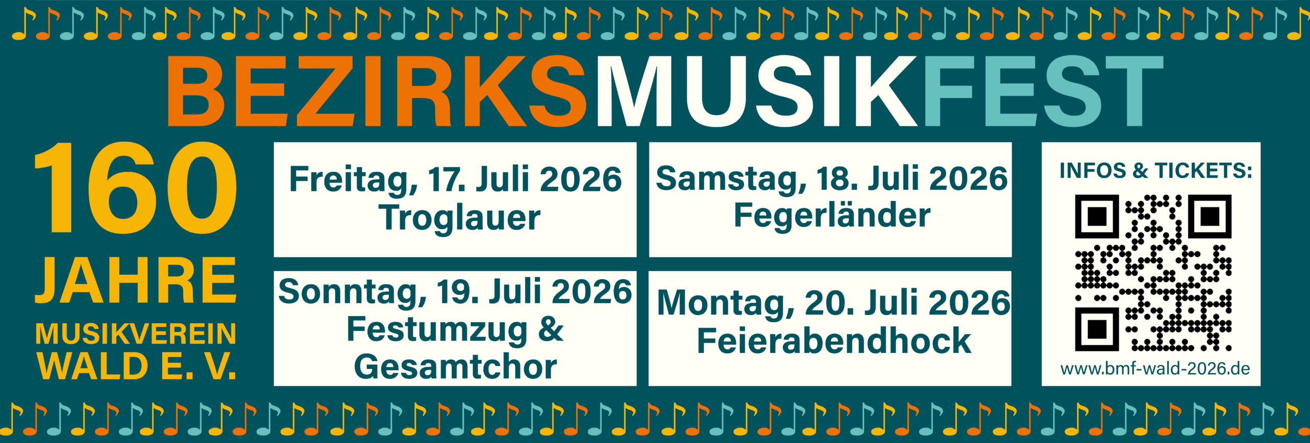 Alle Informationen und unseren Ticketvorverkauf finden Sie auf der Webseite zum Bezirksmusikfest: http://www.bmf-wald-2026.de